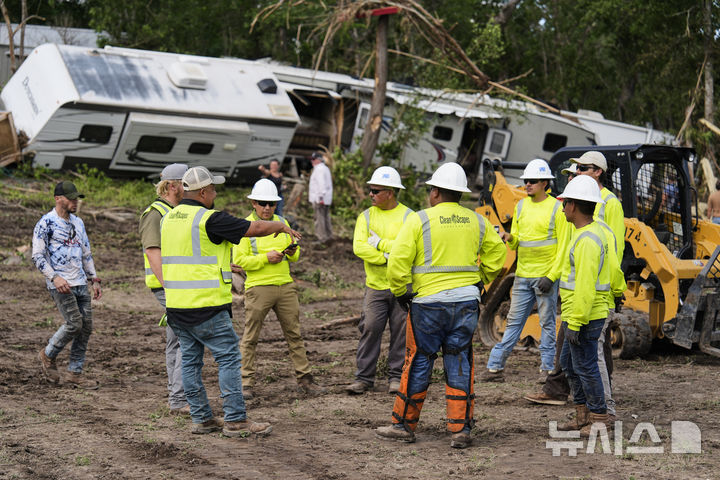 [센터 포인트=AP/뉴시스] 7일(현지 시간) 미 텍사스주 센터 포인트 과달루페 키스 리조트 내 RV 공원에서 주민들이 홍수 피해 복구를 돕고 있다. 텍사스주를 강타한 폭우와 홍수로 '캠프 미스틱'에 참가했던 어린이 중 27명이 숨지면서 사망자 수는 100명을 넘어선 것으로 알려졌다. 2025.07.08.