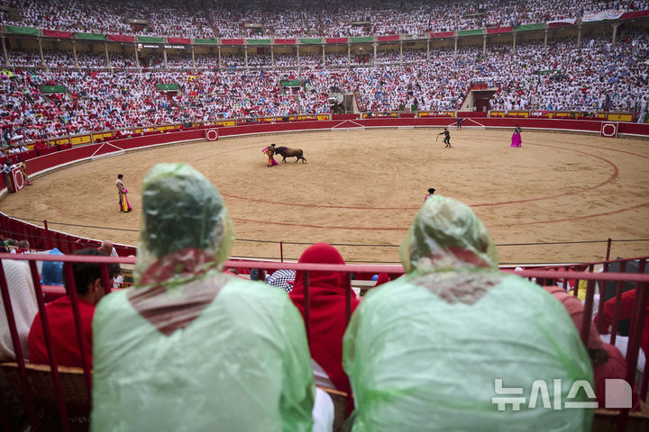 [팜플로나=AP/뉴시스] 7일(현지 시간) 스페인 북부 팜플로나에서 열린 산 페르민 축제 중 우비를 입은 관중이 빗속에서 투우 경기를 지켜보고 있다. 올해 산 페르민 축제는 6일부터 14일까지 열리며 소몰이 행사(엔시에로)와 투우는 '전통 축제'와 '동물 학대' 사이에서 해마다 논란이 되고 있다. 2025.07.08.