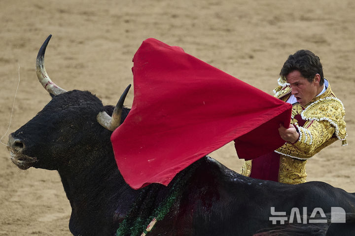 [팜플로나=AP/뉴시스] 7일(현지 시간) 스페인 북부 팜플로나에서 열린 산 페르민 축제 중 투우사 다니엘 루케가 투우를 펼치고 있다. 올해 산 페르민 축제는 6일부터 14일까지 열리며 소몰이 행사(엔시에로)와 투우는 '전통 축제'와 '동물 학대' 사이에서 해마다 논란이 되고 있다. 2025.07.08.