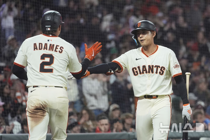 [샌프란시스코=AP/뉴시스] 샌프란시스코 자이언츠의 이정후(오른쪽)가 7일(현지 시간) 미 캘리포니아주 샌프란시스코 오라클 파크에서 열린 2025 메이저리그 필라델피아 필리스와의 경기 8회 말 타석에 들어서면서 득점한 윌리 아다메스를 환영하고 있다. 이정후는 4타수 1안타 1타점 1삼진을 기록했고 샌프란시스코는 3-1로 승리했다. 2025.07.08.