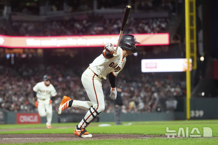 [샌프란시스코=AP/뉴시스] 샌프란시스코 자이언츠의 이정후가 7일(현지 시간) 미 캘리포니아주 샌프란시스코 오라클 파크에서 열린 2025 메이저리그 필라델피아 필리스와의 경기 8회 말 1루수 앞 땅볼을 치고 있다. 이정후는 야수 선택으로 1루에서 세이프됐고 3루 주자 맷 채프먼을 불러들이는 타점을 올렸다. 2025.07.08.