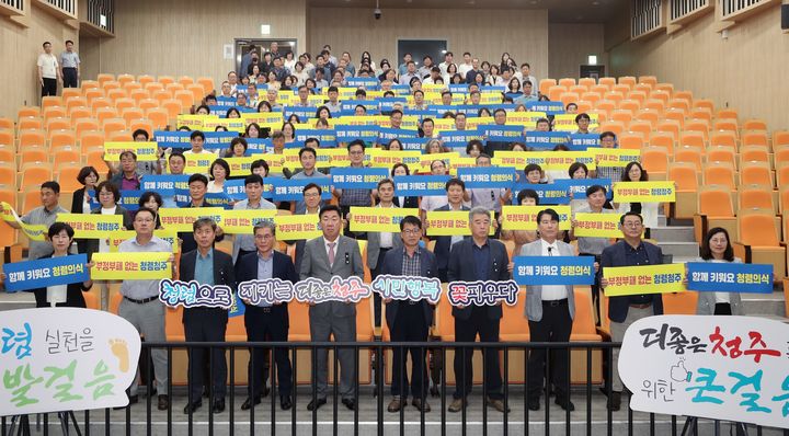 [청주=뉴시스] 8일 충북 청주시 한국공예관 공연장에서 열린 청주시 청렴결의대회에서 이범석 시장을 비롯한 간부 공무원들이 청렴 의지를 다지고 있다. (사진=청주시 제공) 2025.07.08. [email protected]