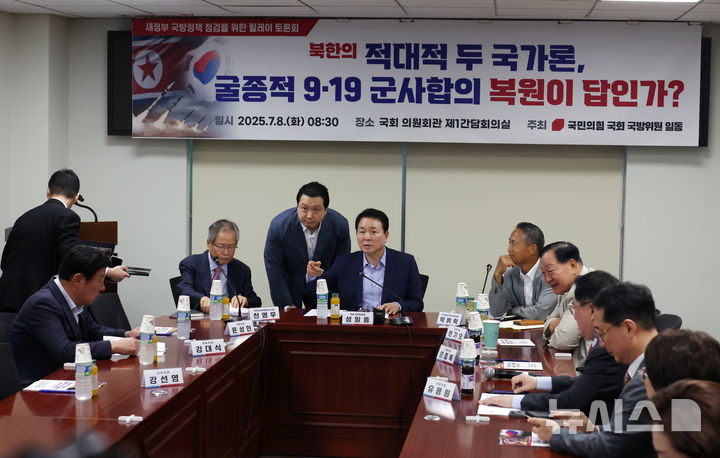 [서울=뉴시스] 고승민 기자 = 성일종 국회 국방위원장 등 의원들이 8일 서울 여의도 국회 의원회관에서 성일종 등 국민의힘 국방위원 일동 주최로 열린 새정부 국방정책 점검을 위한 릴레이 토론회에서 대화하고 있다. 2025.07.08. [email protected]