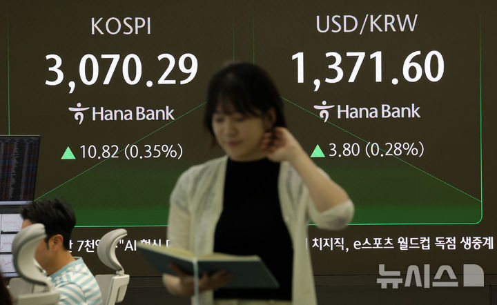 [서울=뉴시스] 홍효식 기자 = 코스피가 전 거래일(3059.47)보다 12.27포인트(0.40%) 상승한 3071.74에 개장 출발한 8일 오전 서울 중구 하나은행 딜링룸 전광판에 지수가 표시되고 있다.