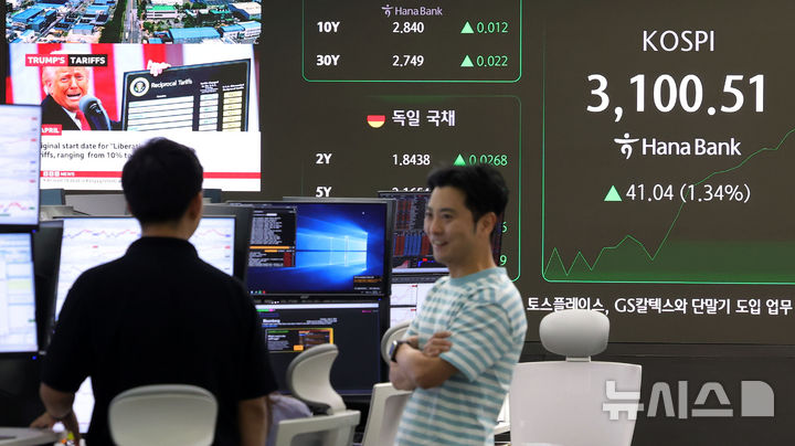[서울=뉴시스] 홍효식 기자 = 도널드 트럼프 미국 대통령이 다음달 1일부터 모든 한국산 제품에 25%의 상호관세를 부과하겠다고 통보한 8일 오전 서울 중구 하나은행 딜링룸 전광판에 개장 시황이 표시되고 있다.