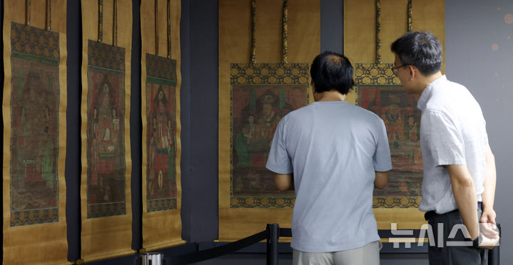 [서울=뉴시스] 추상철 기자 = 8일 오전 서울 종로구 국립고궁박물관에서 열린 '환수 문화유산 언론공개회'에서 일본 환수 감지금니 대방광불화엄경 주본 권22 및 시왕도가 공개되고 있다. 2025.07.08. [email protected]