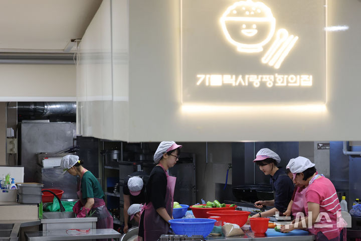 [서울=뉴시스] 권창회 기자 = 염영남 뉴시스 대표이사를 비롯한 직원들이 8일 서울 용산구 가톨릭사랑평화의집에서 도시락 배달 봉사를 하기 위해 음식을 만들고 있다. 2025.07.08. [email protected]
