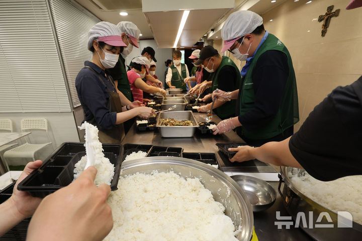 [서울=뉴시스] 권창회 기자 = 염영남 뉴시스 대표이사를 비롯한 직원들이 8일 서울 용산구 가톨릭사랑평화의집에서 도시락 배달 봉사를 하기 위해 음식을 포장하고 있다. 2025.07.08. [email protected]