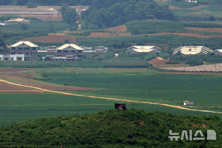[파주=뉴시스] 조성우 기자 = 김정은 북한 국무위원장이 할아버지 김일성 주석 사망 31주기인 8일 경기도 파주시 오두산 통일전망대에서 북한 황해북도 개풍군 일대가 보이고 있다. 2025.07.08. [email protected]