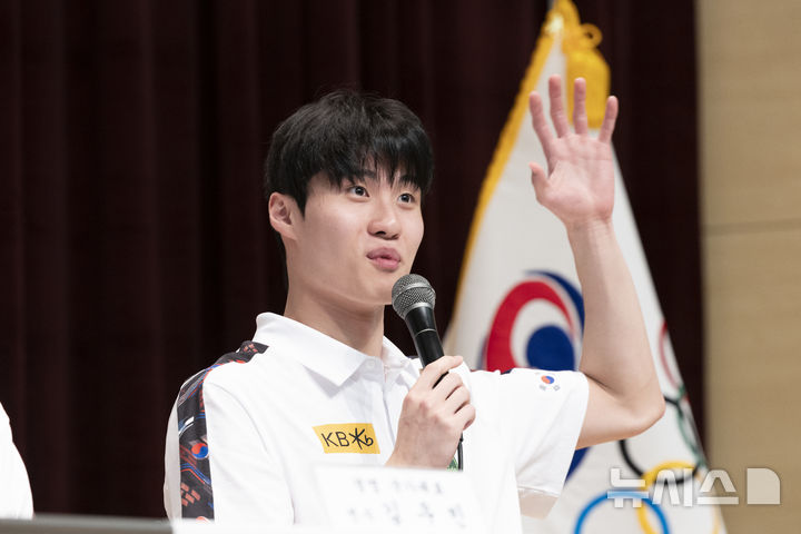 [진천=뉴시스] 김근수 기자 = 수영 국가대표 황선우가 8일 충북 진천선수촌 챔피언하우스에서 열린 대한수영연맹 미디어데이에서 인터뷰하고 있다. 2025.07.08. [email protected]