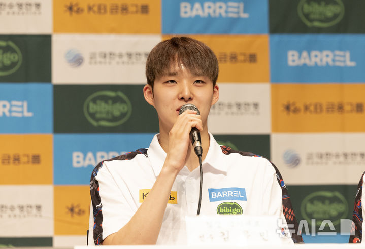 [진천=뉴시스] 김근수 기자 = 수영 국가대표 김우민이 8일 충북 진천선수촌 챔피언하우스에서 열린 대한수영연맹 미디어데이에서 인터뷰를 하고 있다. 2025.07.08. [email protected]