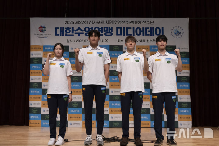 [진천=뉴시스] 김근수 기자 = 수영 국가대표 황선우, 김우민을 비롯한 선수들이 8일 충북 진천선수촌 챔피언하우스에서 열린 대한수영연맹 미디어데이에서 인터뷰를 마치고 기념촬영을 하고 있다. 왼쪽부터 김승원, 김영범, 김우민, 황선우. 2025.07.08. [email protected]
