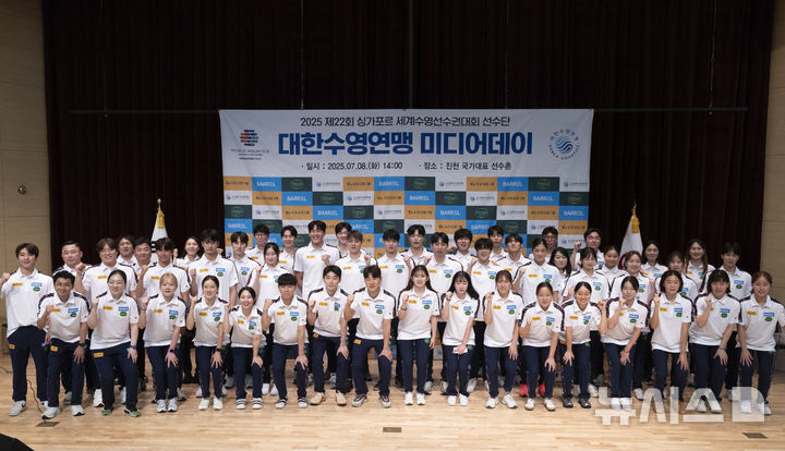 [진천=뉴시스] 김근수 기자 = 2025 싱가포르 세계수영선수권대회에 참가하는 대한민국 국가대표 선수들이 8일 충북 진천선수촌 챔피언하우스에서 열린 대한수영연맹 미디어데이에서 인터뷰를 마치고 기념촬영을 하고 있다. 2025.07.08. [email protected]