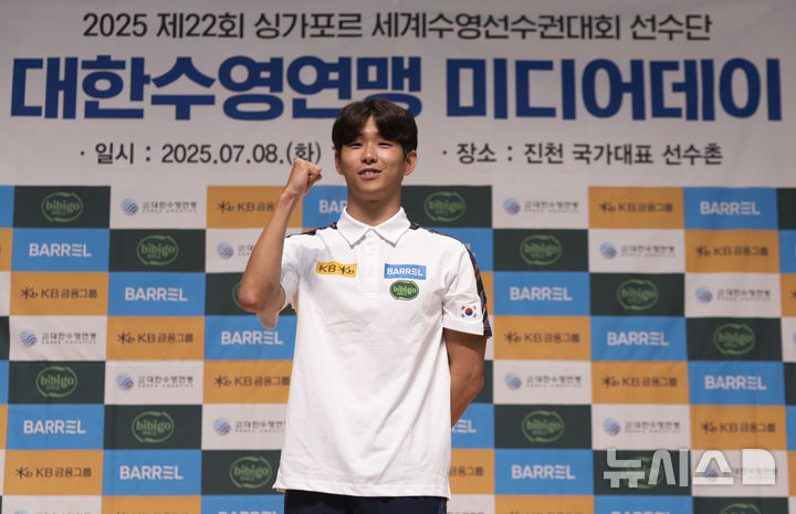 [진천=뉴시스] 김근수 기자 = 2025 싱가포르 세계수영선수권대회 오픈워터스위밍 국가대표 박재훈이 8일 충북 진천선수촌 챔피언하우스에서 열린 대한수영연맹 미디어데이에서 인터뷰를 마치고 기념촬영을 하고 있다. 2025.07.08. [email protected]