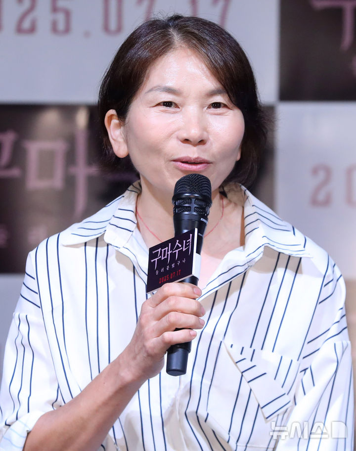 [서울=뉴시스] 김혜진 기자 = 배우 김미숙이 8일 오후 서울 용산구 CGV용산아이파크몰에서 열린 영화 '구마수녀 - 들러붙었구나'(감독 노홍진) 언론시사회에서 인사말을 하고 있다. 2025.07.08. [email protected]