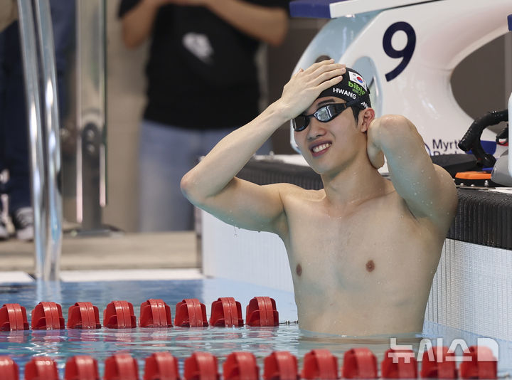 [진천=뉴시스] 김근수 기자 = 2025 싱가포르 세계수영선수권대회 수영 국가대표 황선우가 8일 충북 진천선수촌 수영센터에서 훈련을 하고 있다. 2025.07.08. [email protected]