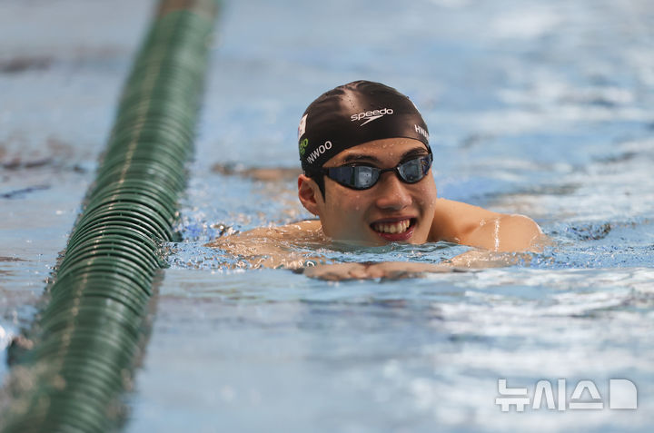[진천=뉴시스] 김근수 기자 = 2025 싱가포르 세계수영선수권대회 수영 국가대표 황선우가 8일 충북 진천선수촌 수영센터에서 훈련을 하고 있다. 2025.07.08. [email protected]