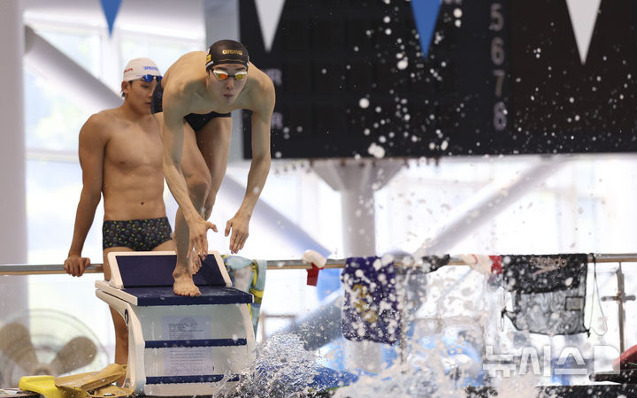 [진천=뉴시스] 김근수 기자 = 2025 싱가포르 세계수영선수권대회 수영 국가대표 김우민이 8일 충북 진천선수촌 수영센터에서 훈련을 하고 있다. 2025.07.08. [email protected]