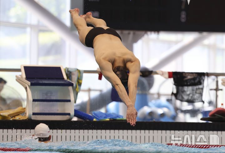 [진천=뉴시스] 김근수 기자 = 2025 싱가포르 세계수영선수권대회 수영 국가대표 황선우가 8일 충북 진천선수촌 수영센터에서 훈련을 하고 있다. 2025.07.08. [email protected]