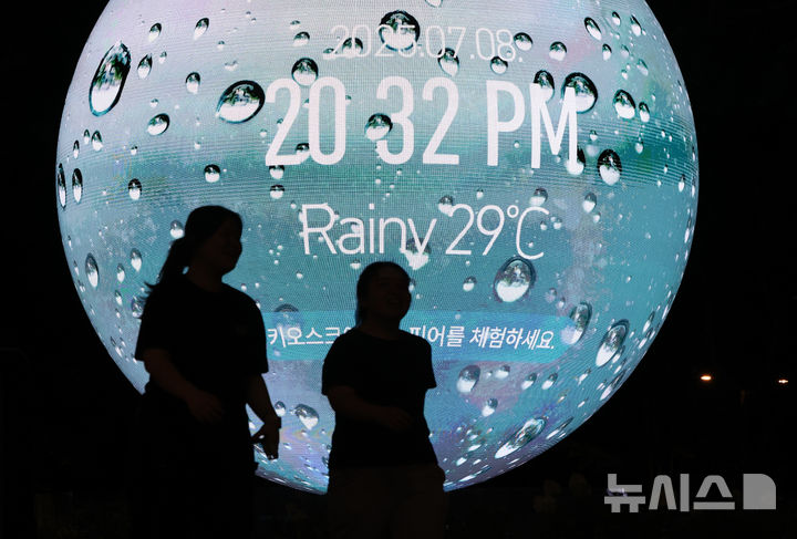 [서울=뉴시스] 황준선 기자 = 서울에 연일 열대야 현상이 지속되고 있는 8일 밤 서울 송파구의 한 조형물에 현재 기온이 표출되고 있다. 2025.07.08. [email protected]