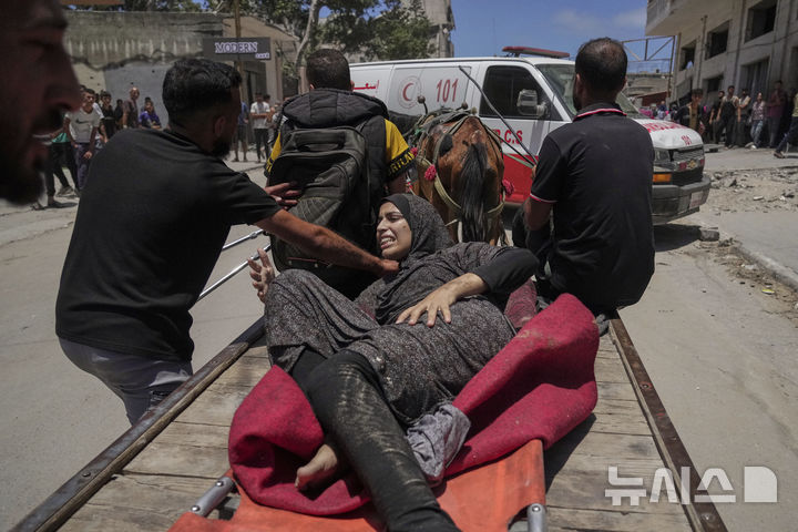 [가자시티=AP/뉴시스] 8일(현지 시간) 가자지구 가자시티에서 이스라엘의 공습으로 피란민들이 머물던 천막이 공격을 받은 뒤 한 여성이 들것에 실려 대피하고 있다. 이스라엘과 하마스 간 휴전 협상이 사흘째 이어지는 가운데, 가자지구 보건당국은 지난 하루 동안 이스라엘군의 공습으로 105명이 숨지고 356명이 다쳤다고 밝혔다. 2025.07.09.