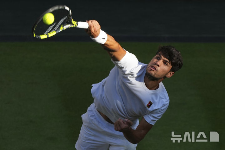 [런던=AP/뉴시스] 카를로스 알카라스(2위·스페인)가 8일(현지 시간) 영국 런던 올잉글랜드 클럽에서 열린 2025 윔블던 테니스 대회 남자 단식 8강전에서 캐머런 노리(61위·영국)와 경기하고 있다. 3연패를 노리는 알카라스가 3-0(6-2 6-3 6-3)으로 승리하고 4강에 올랐다. 2025.07.09.