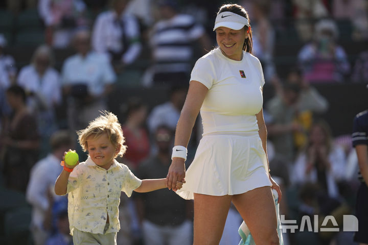 [런던=AP/뉴시스] 어맨다 아니시모바(12위·미국)가 8일(현지 시간) 영국 런던 올잉글랜드 클럽에서 열린 2025 윔블던 테니스 대회 여자 단식 8강전에서 아나스타시야 파블류첸코바(50위·러시아)를 2-0(6-1 7-6)으로 꺾은 뒤 조카 잭슨과 함께 자축하고 있다. 통산 2번째 메이저 4강에 오른 아니시모바는 아리나 사발렌카(1위·벨라루스)와 결승 진출을 다툰다. 2025.07.09.