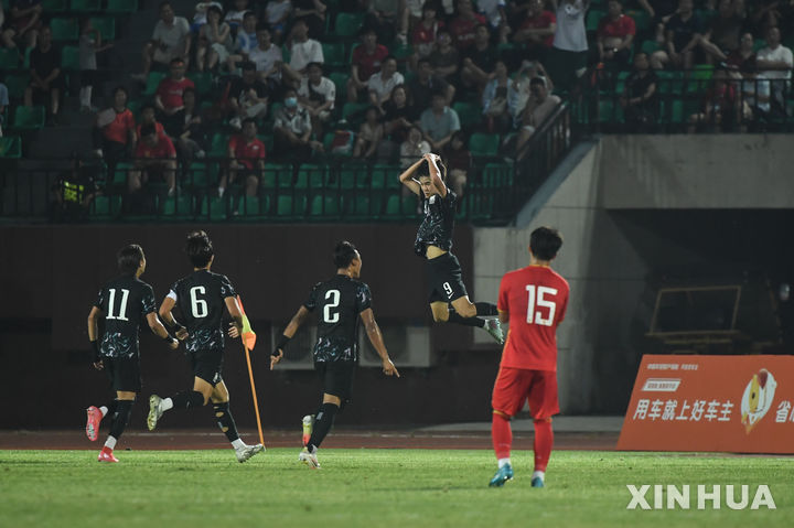 [선양=신화/뉴시스] 대한민국 16세 이하(U-16) 축구 대표팀 선수들이 8일(현지 시간) 중국 랴오닝성 선양의 선양 스타디움에서 열린 2025 중국축구협회(CFA) 4개국 친선 축구대회 최종전 중국과 경기 중 득점에 환호하고 있다. 한국이 김지호의 멀티 골을 앞세워 4-3으로 승리해 대회 3연승으로 우승을 차지했다. 2025.07.09.