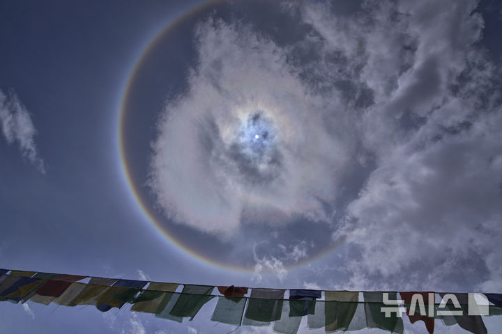 [탕체=AP/뉴시스] 8일(현지 시간) 인도 레 남동쪽 탕체 도로에 걸려 있는 불교 깃발 상공 태양 주변에 헤일로(광륜·햇무리) 현상이 나타나고 있다. 헤일로 현상은 대기 중에 떠 있는 얼음 결정들이 태양 빛을 굴절·반사하면서 무지개색 고리 모양으로 발생하는 광학 현상이다. 2025.07.09.