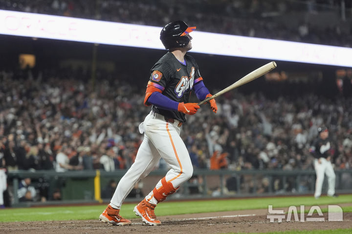 [샌프란시스코=AP/뉴시스] 샌프란시스코 자이언츠의 패트릭 베일리가 8일(현지 시간) 미 캘리포니아주 샌프란시스코 오라클 파크에서 열린 2025 메이저리그 필라델피아 필리스와의 경기 9회 말 우측 담장으로 향하는 타구를 바라보고 있다. 이 타구는 끝내기 그라운드 3점 홈런으로 이어졌으며 샌프란시스코는 4-3으로 역전승했다. 2025.07.09.