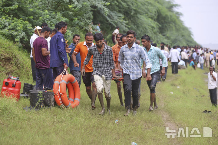 [바도다라=AP/뉴시스] 9일(현지 시간) 인도 구자라트주 바도다라 인근 무즈퍼러의 감브히라 다리 일부가 무너져 차량 여러 대가 강으로 추락한 가운데, 구조대와 주민들이 희생자 시신을 옮기고 있다. 현지 당국은 이날 오전 출근 시간대에 교량이 무너져 최소 9명이 숨졌다고 밝혔다 2025.07.09.
