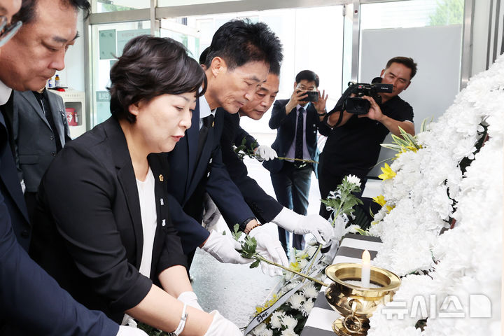 [청주=뉴시스] 이양섭 충북도의장을 비롯한 도의원과 사무처 직원들이 9일 청주시 상당구 북문로1가 청주시청 임시청사에 마련된 시민분향소를 찾아 헌화와 묵념을 하고 있다.
