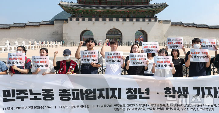 [서울=뉴시스] 추상철 기자 = 9일 오전 서울 종로구 광화문 월대 앞에서 열린 민주노총 총파업지지 청년·학생 기자회견에서 참가자들이 구호를 외치고 있다. 2025.07.09. [email protected]