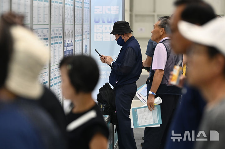 [수원=뉴시스] 김종택 기자 = 9일 경기 수원시 권선구 수원메쎄에서 열린 '경기도 5070 일자리 박람회'에서 중장년 구직자들이 채용공고게시대를 살펴보고 있다. 2025.07.09. [email protected]