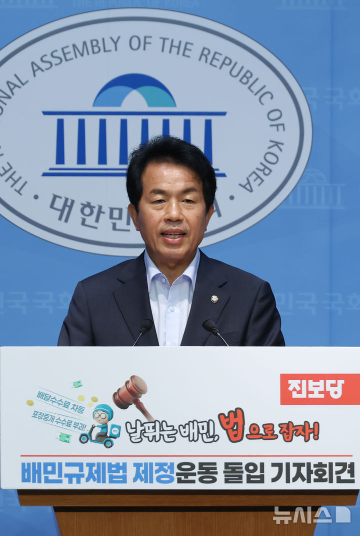 [서울=뉴시스] 고승민 기자 = 윤종오 진보당 원내대표가 9일 서울 여의도 국회 소통관에서 '배민규제법 제정운동 돌입 기자회견'을 하고 있다. 2025.07.09. [email protected]