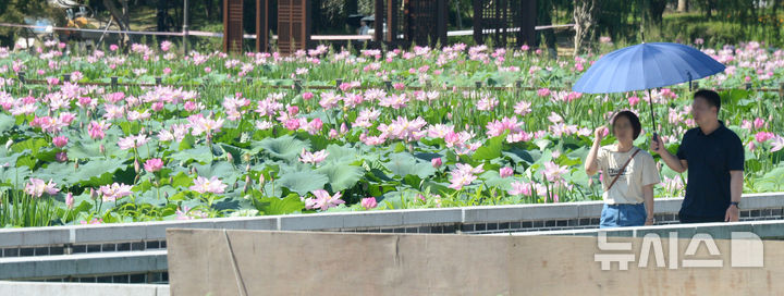 [전주=뉴시스] 김얼 기자 = 여름날씨가 이어지고 있는 9일 전북 전주시 전주덕진공원에 연꽃이 만개해 있다. 2025.07.09. [email protected]