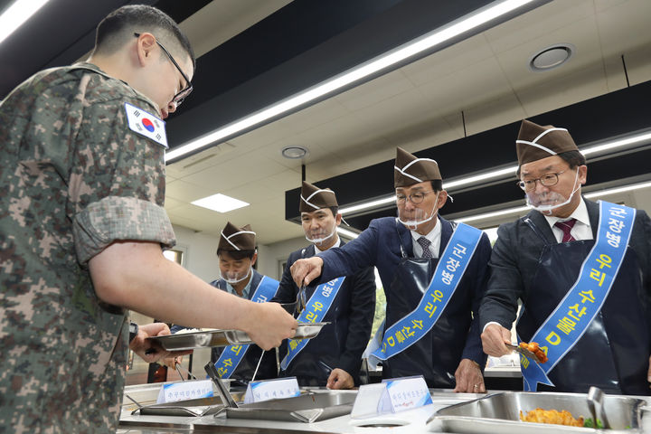 [서울=뉴시스] 노동진 수협중앙회장이 9일 육군 7군단에서 군 장병에게 수산물 특식을 제공하는 '우리 수산물 DAY'를 연 뒤 완성된 요리를 배식하고 있다. (사진=수협 제공) 2025.07.09. [email protected]
