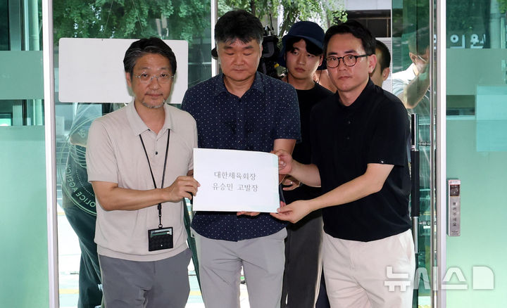 [서울=뉴시스] 추상철 기자 = 정용철(왼쪽부터) 체육시민연대 공동대표, 이대택 스포츠 인권 연구소 대표, 김현수 체육시민연대 집행위원장이 9일 오후 서울 종로구 서울경찰청에서 유승민 대한체육회장 비리 고발장을 제출하기 위해 이동하고 있다. 2025.07.09. [email protected]