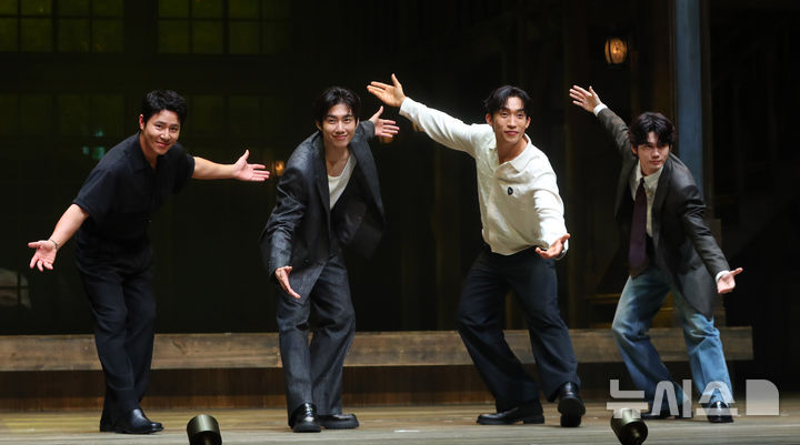 [서울=뉴시스] 김혜진 기자 = 배우 이규형(왼쪽부터), 손우현, 이상이, 옹성우가 9일 오후 서울 서초구 예술의전당 CJ토월극장에서 열린 연극 '셰익스피어 인 러브' 기자간담회에서 포즈를 취하고 있다. 2025.07.09. [email protected]