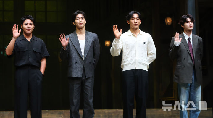 [서울=뉴시스] 김혜진 기자 = 배우 이규형(왼쪽부터), 손우현, 이상이, 옹성우가 9일 오후 서울 서초구 예술의전당 CJ토월극장에서 열린 연극 '셰익스피어 인 러브' 기자간담회에서 포즈를 취하고 있다. 2025.07.09. [email protected]