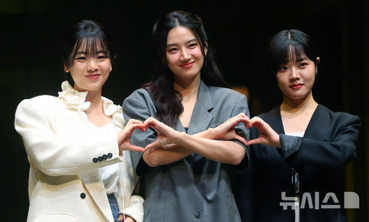 [서울=뉴시스] 김혜진 기자 = 배우 이주영(왼쪽부터), 박주현, 김향기가 9일 오후 서울 서초구 예술의전당 CJ토월극장에서 열린 연극 '셰익스피어 인 러브' 기자간담회에서 포즈를 취하고 있다. 2025.07.09. [email protected]
