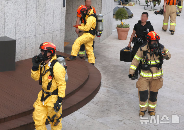 [인천=뉴시스] 전진환 기자 = 9일 오후 인천 서구의 한 아파트단지 내 수영장 소독용 액체염소가 누출돼 소방관들이 조사를 위해 들어가고 있다. 소방당국은 신고 32분 만인 이날 오후 3시34분께 대응 1단계를 발령하고 인력 105명과 장비 48대를 투입해 안전조치하고 있다. 2025.07.09. [email protected]