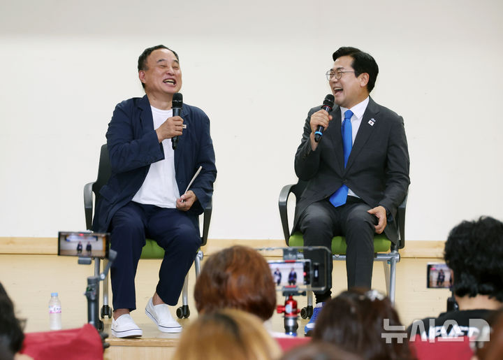 [서울=뉴시스] 고승민 기자 = 더불어민주당 대표 선거에 출마하는 박찬대 전 원내대표가 9일 서울 여의도 국회 의원회관에서 열린 '진짜 대한민국 ON AIR 유튜브 토크콘서트'에서 참석자들과 이야기를 나누고 있다. 2025.07.09. [email protected]