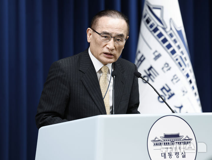 [서울=뉴시스] 최동준 기자 = 방미 일정을 마치고 귀국한 위성락 국가안보실장이 9일 서울 용산 대통령실에서 관세협상 및 방위비 관련 브리핑을 하고 있다. 2025.07.09. [email protected]
