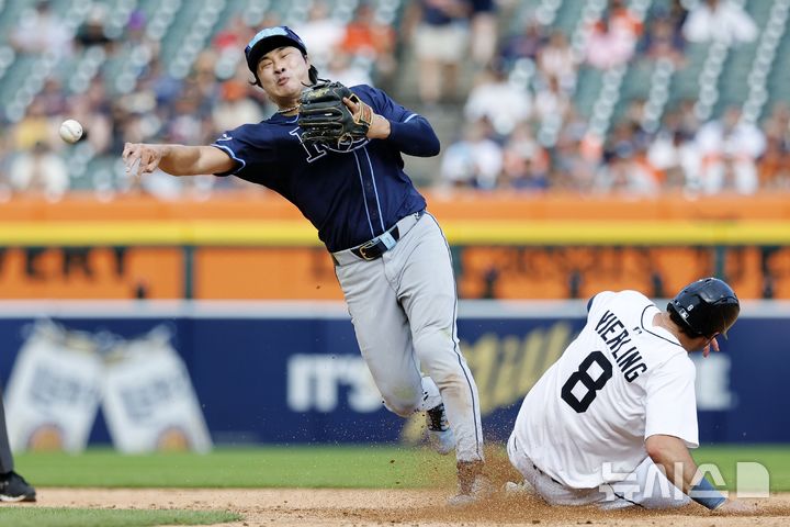 [디트로이트=AP/뉴시스] 탬파베이 레이스 유격수 김하성이 9일(현지 시간) 미 미시간주 디트로이트 코메리카 파크에서 열린 2025 메이저리그 디트로이트 타이거스와의 경기 4회 말 맷 비어링을 포스 아웃시킨 후 1루에 송구하고 있다. 2025.07.09.