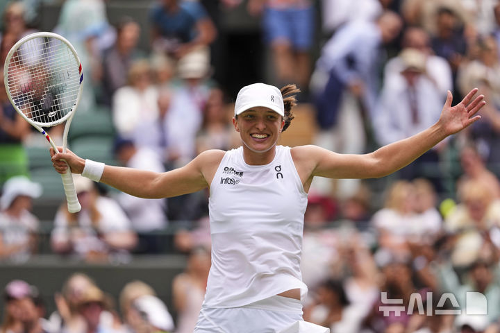 [런던=AP/뉴시스] 이가 시비옹테크(4위·폴란드)가 9일(현지 시간) 영국 런던 올잉글랜드 클럽에서 열린 2025 윔블던 테니스 대회 여자 단식 8강전에서 류드밀라 삼소노바(20위·러시아)를 물리친 후 환호하고 있다. 시비옹테크가 2-0(6-2 7-5)으로 승리하고 처음으로 4강에 올라 벨린다 벤치치(35위·스위스)와 결승 진출을 다툰다. 2025.07.10.
