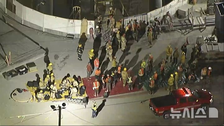 [로스앤젤레스=AP/뉴시스] KABC/ABC7 로스앤젤레스가 제공한 영상 사진에 9일(현지 시간) 미 캘리포니아주 로스앤젤레스 윌밍턴에서 공사 중이던 산업용 터널이 붕괴해 긴급 구조대가 구조 작업을 벌이고 있다. 현지 언론에 따르면 이 사고로 지하에서 작업 중이던 근로자 31명이 고립됐다가 모두 구조됐다. LA 소방국(LAFD)은 출입구에서 약 9.6㎞ 떨어진 지점에서 사고가 발생했으며, 구조대가 크레인과 구조 케이지를 이용해 순차적으로 작업자들을 끌어올렸다고 밝혔다. 2025.07.10.