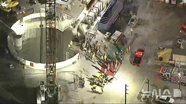 [로스앤젤레스=AP/뉴시스] KABC/ABC7 로스앤젤레스가 제공한 영상 사진에 9일(현지 시간) 미 캘리포니아주 로스앤젤레스 윌밍턴에서 공사 중이던 산업용 터널이 붕괴해 긴급 구조대가 구조 작업을 벌이고 있다. 현지 언론에 따르면 이 사고로 지하에서 작업 중이던 근로자 31명이 고립됐다가 모두 구조됐다. LA 소방국(LAFD)은 출입구에서 약 9.6㎞ 떨어진 지점에서 사고가 발생했으며, 구조대가 크레인과 구조 케이지를 이용해 순차적으로 작업자들을 끌어올렸다고 밝혔다. 2025.07.10.