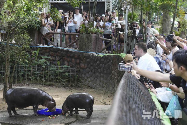 [촌부리=AP/뉴시스] 10일(현지 시간) 태국 촌부리주의 카오키여우 동물원에서 관람객들이 만 한 살 된 피그미하마 '무뎅'(오른쪽)과 엄마 '조나'가 먹이 먹는 모습을 구경하고 있다. 2025.07.10.