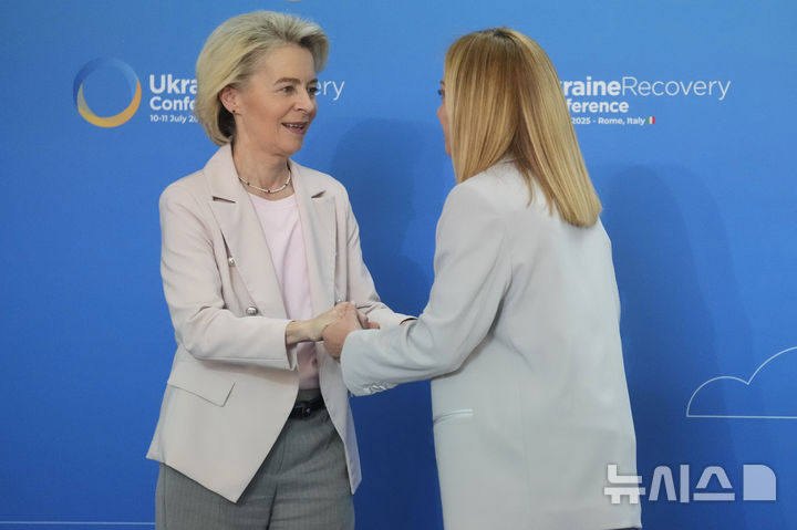 [로마=AP/뉴시스]우르줄라 폰 데어 라이엔 유럽연합(EU) 집행위원장이 10일 로마에서 열린 우크라이나 복구 회의에서 조르지아 멜로니 이탈리아 총리와 인사하고 있다. 폰 데어 라이엔 위원장은 이날 유럽의회에서 실시된 자신에 대한 불신임투표에서 가볍게 승리, 살아남았다. 2025.07.10.